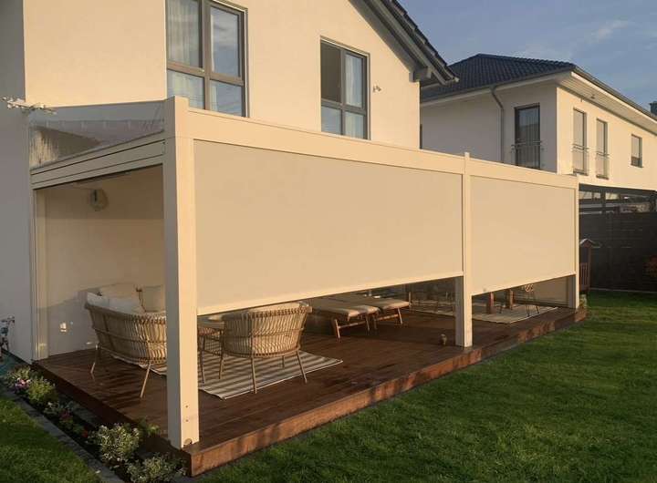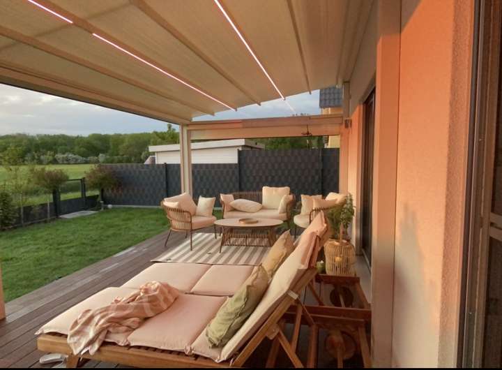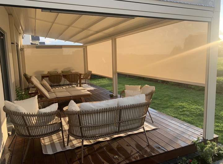 Besonderes Highlight ist die exclusive Terrassenüberdachung des italienischen Herstellers Pratik.