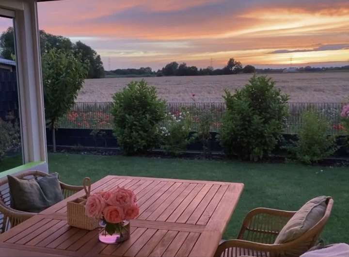 Durch die bodentiefen Fenster gelangen Sie direkt auf die Terrasse. Diese ist überdacht und selbst bei schlechtem Wetter können Sie mit Ihrer Familie oder Gästen die Zeit draußen verbringen.