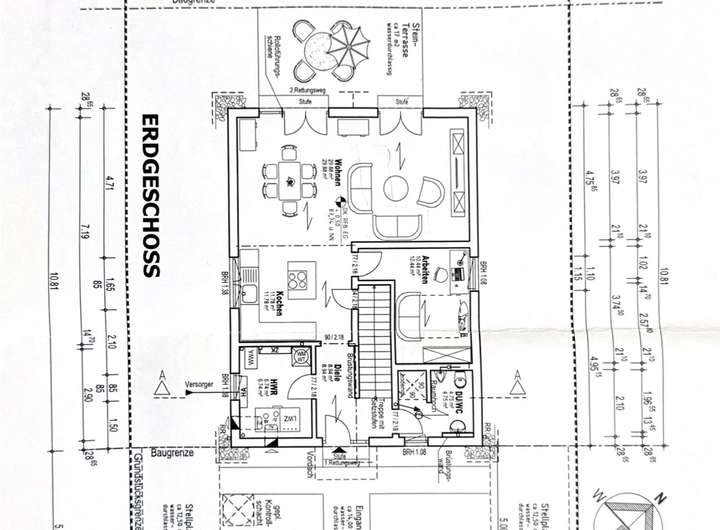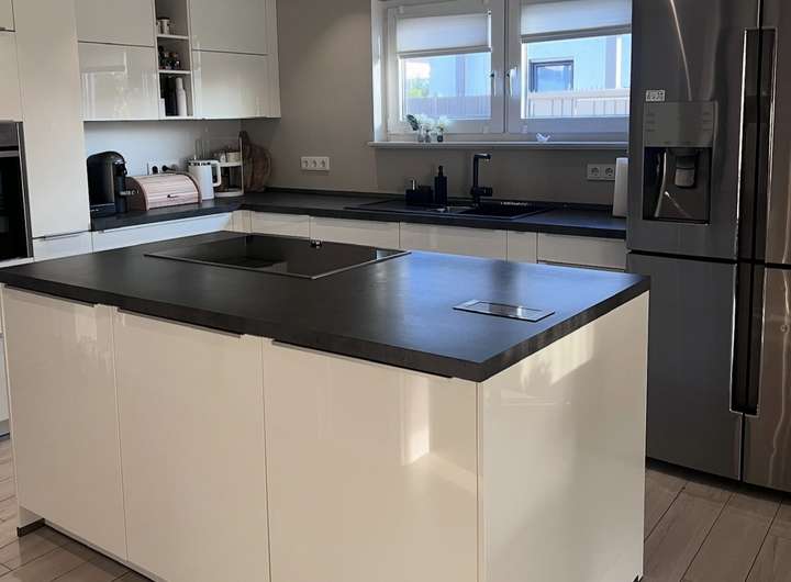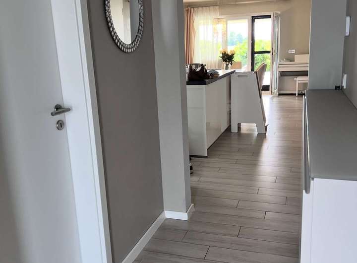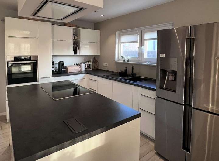 Im Erdgeschoss befindet sich der große Wohn-/ und Essbereich mit einer hochwertigen Einbauküche der Firma Alno.