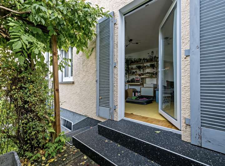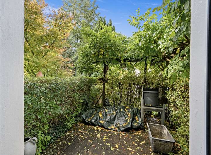 Eine sonnige Terrasse mit angrenzendem kleinen Garten lädt zum Entspannen im Freien ein.