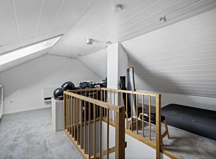 Im Obergeschoss befinden sich ein Schlafzimmer und ein Kinderzimmer, während die ausgebaute Bühne zusätzlichen Platz als Studio oder Hobbyraum bietet. Das Badezimmer ist gepflegt und mit einer Badewanne, einer Dusche, einem Waschbecken und einem WC funktional gestaltet.