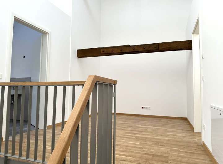 Das Obergeschoss erreichen Sie über eine stilvolle Treppe, die industriellen Charme mit Landhausstil vereint. Auf dieser Etage finden Sie neben dem Elternschlafzimmer, auch das Hauptbadezimmer. Dieses ist mit einer barrierefreien Dusche ausgestattet. Außerdem finden Sie hier auch den Waschmaschinenanschluss des Hauses. Hier können optimal die Waschmaschine und der Trockner übereinander gestellt werden.