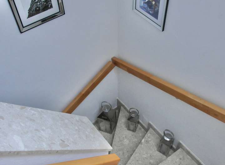 Das Erdgeschoss verfügt über eine Küchenzimmer mit Einbauküche, die durch eine Glastüre mit dem großzügigen Wohn-/Essbereich verbunden ist. Dem Wohnbereich ist ein knapp 14 m2 großer, beheizter Wintergarten vorgelagert. Neben Abstellraum und Hauswirtschaftsraum gibt es ein Gäste-WC. Im Wohnbereich ist ein Parkettlaminatboden verlegt, die übrigen Flächen im EG sind durchgängig mit hochwertigen Kunststeinboden gefliest. Im Obergeschoss gibt es drei separate Zimmer von jeweils ca. 12 m2 und ein großzügiges, gefliestes Vollbad mit Dusche und Badewanne. Technische Ausstattung, Sanitärinstallationen und baukonstruktive Ausführung entsprechen einem modernen Standard; die Fenster im EG verfügen über Außenrollläden (teilweise elektrisch gesteuert).