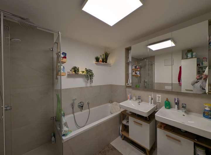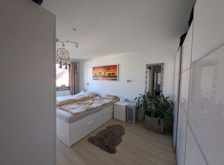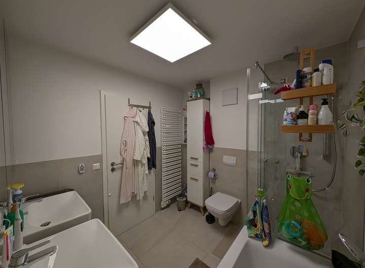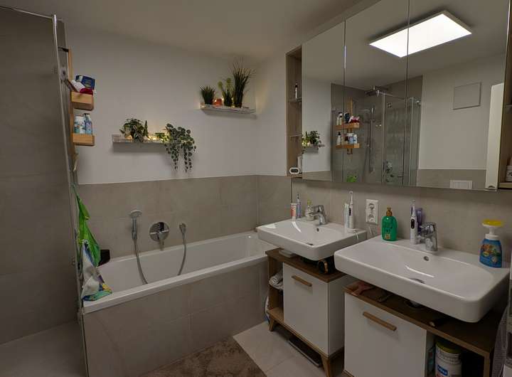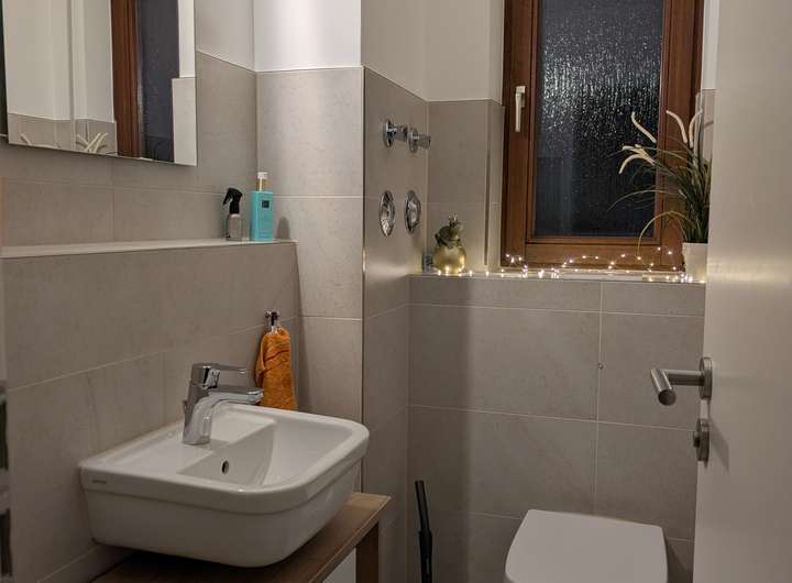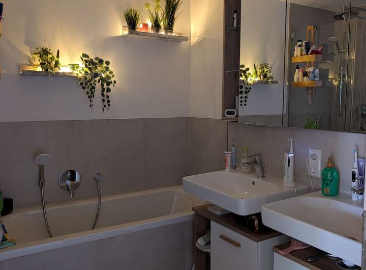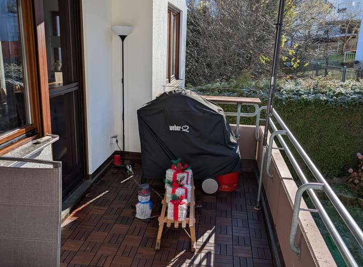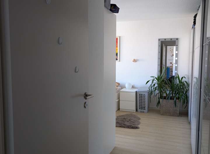 Im Wohnzimmer und Schlafzimmer haben wir Fliegengittertüren anbringen lassen. Der Spiegelschrank im Bad wurde unsererseits auf Maß angefertigt. Auf dem Balkon haben wir Holzfliesen verlegt und eine manuelle Markise angebracht. Diese Investitionen überlassen wir gerne dem Nachmieter, sofern gewünscht.