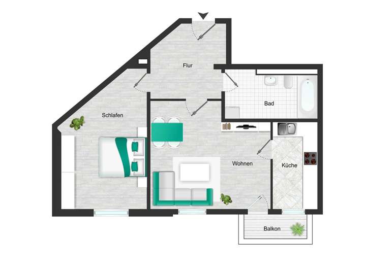 Vom zentral gelegenen Flur aus sind Wohn- und Schlafzimmer als auch das Badezimmer bequem erreichbar: