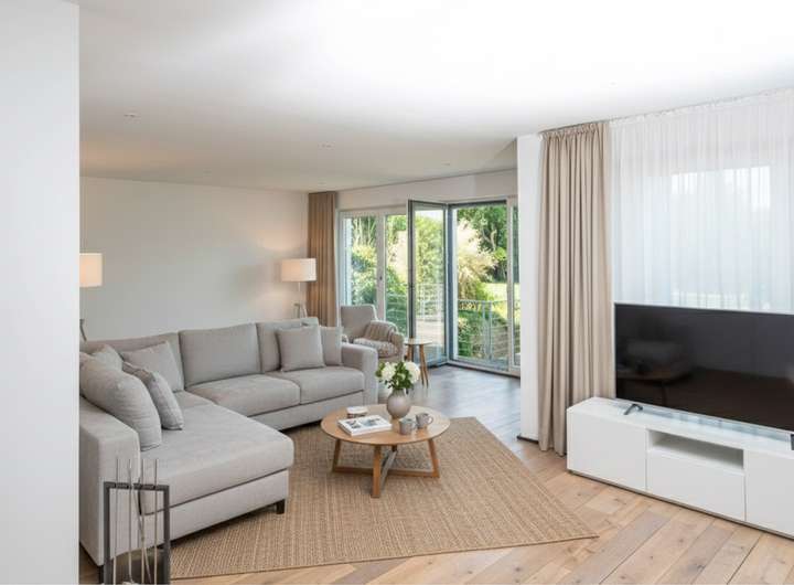 Der Wohnbereich überzeugt durch eine offene Architektur mit fließenden Übergängen zwischen Küche, Ess- und Wohnraum – inklusive Kamin und direktem Zugang zu Terrasse und Garten.