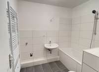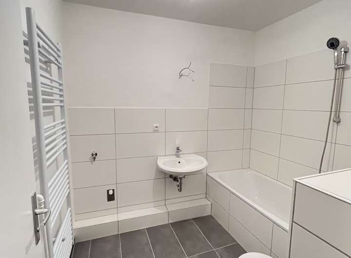 Es erwartet Sie ein neues und modernes Badezimmer mit Badewanne und Platz für Ihre Waschaschine.