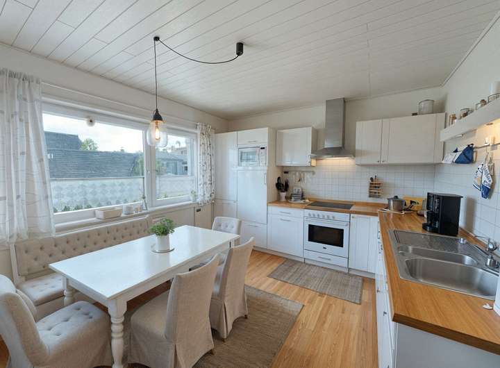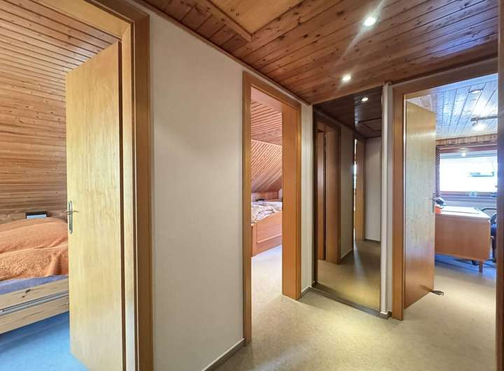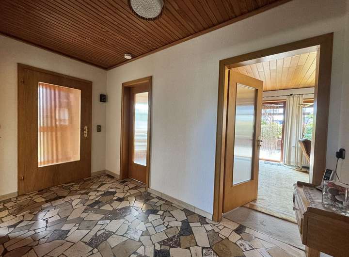 Das Wohnzimmer und das Esszimmer haben einen Teppichbodenbelag. Die Diele, der Windfang, die Küche und das Esszimmer sowie die Bäder sind gefliest. Die Schlafräume haben textile Bodenbeläge.