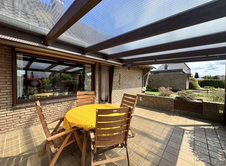 Die große Terrasse betreten Sie vom Wohnzimmer. Diese ist nach Süden ausgerichtet und überdacht und bietet einen tollen Blick in den geschmackvoll angelegten und gepflegten Garten.