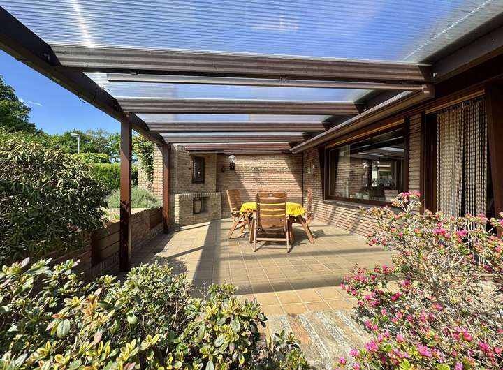 Auf der Terrasse gibt es einen Außenkamin, der aber in den letzten Jahren nicht mehr genutzt wurde. Eine elektrische Markise zur Beschattung ist ebenfalls vorhanden.