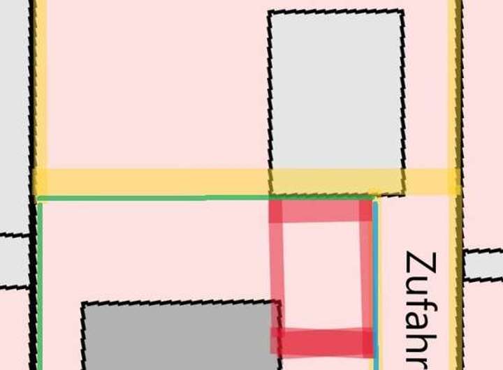 Das im Moment noch vorhandene Garagengebäude gehört zum Hintergrundstück und wird abgerissen. Es wird ein neues Carport mit einer Größe von ca. 3 x 6 Metern errichtet. Auf der rechten Seite befindet sich die Zufahrt zum Hintergrundstück, die im vorderen Bereich gemeinsam genutzt wird. In der beigefügten Skizze ist das Grundstück grün markiert, die blaue Markierung kennzeichnet das Überwegungsrecht für die gemeinsame Zufahrt (mit dem Hintergrundstück) zum Grundstück.