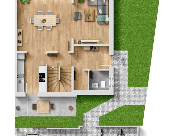 Der moderne Grundriss im Erdgeschoss überzeugt mit einem großzügigen, offenen Wohn-, Ess- und Kochbereich. Eine Garderobe, sowie ein Abstellraum und ein Gäste-WC runden die Ebene von praktischer Seite ab. Direkt vom Wohn-/Essbereich gelangen Sie auf Ihre Terrasse mit angrenzendem Garten. Die Küche ist bereits mit einer modernen und stylischen Einbauküche eingerichtet und bietet einen Zugang zur zweiten Terrasse an der Vorderseite des Hauses.