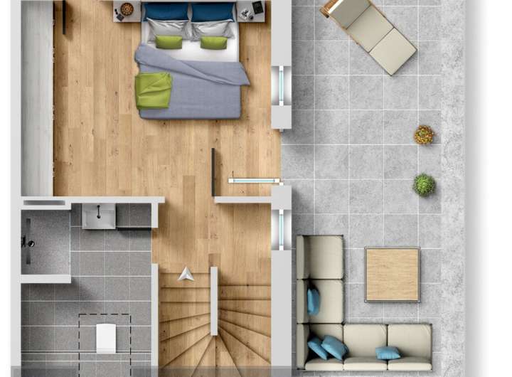 Im Dachgeschoss entsteht ein weiteres geräumiges Zimmer, welches vielseitig genutzt werden kann. Das angrenzende Duschbad mit Tageslicht komplettiert dieses Stockwerk. Das Highlight ist hier die Dachterrasse.