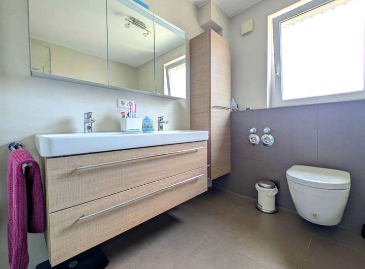 ° Tageslichtbad mit bodengleicher Dusche, Wanne, WC u. großem Doppelwaschtisch