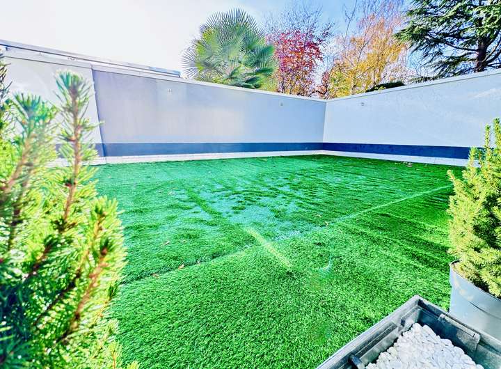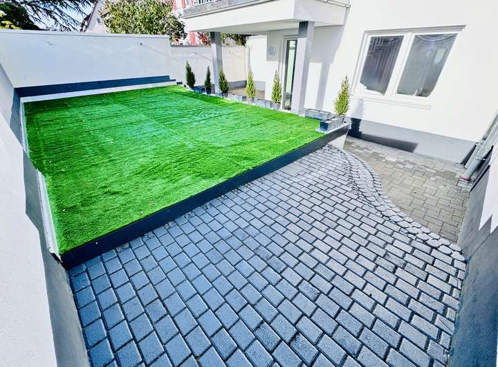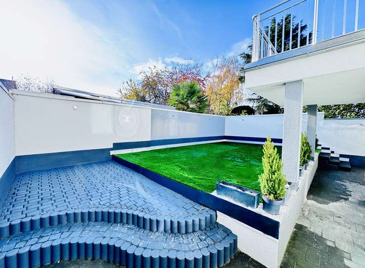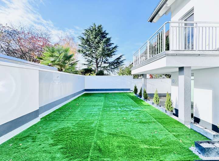 Die großzügige, offene Wohnküche verbindet innen und außen mühelos und führt direkt auf die beiden Terrassen sowie den gepflegten Kunstrasenbereich. Ein Kinderzimmer, ein Arbeitszimmer und ein modernes Bad ergänzen die Ebene. Der direkte Zugang zur Doppelgarage, die sowohl zur Straße als auch rückseitig geöffnet werden kann, sorgt für hohen Alltagskomfort. Über die elegante Innentreppe aus Massivholz mit weißem Geländer gelangt man in das Obergeschoss, das 67,88 m² umfasst. Dort befinden sich das Schlafzimmer mit eigenem Balkon, zwei weitere Zimmer, eine Abstellkammer und ein zweites Bad im gleichen modernen Stil. Eine zusätzliche Wohnungseingangstür auf dieser Etage ermöglicht eine flexible Nutzung des gesamten Maisonettebereichs.
