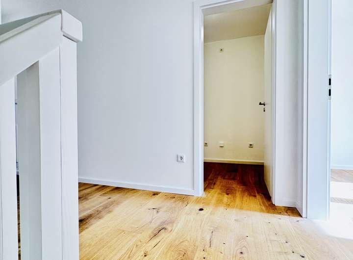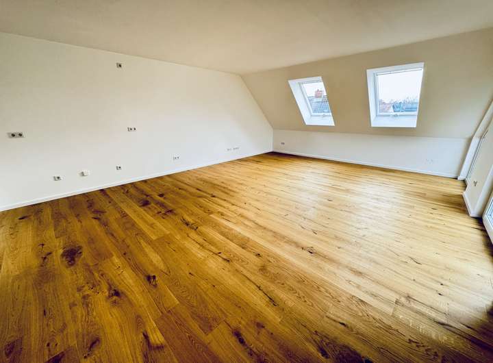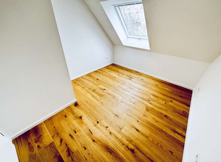 Im ersten Dachgeschoss liegt eine moderne Drei-Zimmer-Wohnung mit 62,63 m² Wohnfläche. Die offene Wohnküche mit Balkon bildet das Zentrum dieser Ebene und verleiht der Wohnung ein angenehmes, luftiges Raumgefühl. Das Schlafzimmer und ein weiteres Zimmer – ideal als Kinderzimmer oder Büro – bieten sinnvolle Nutzungsoptionen. Das zeitlos gestaltete Bad und der durchgängige Parkettboden unterstreichen den hochwertigen Gesamteindruck.