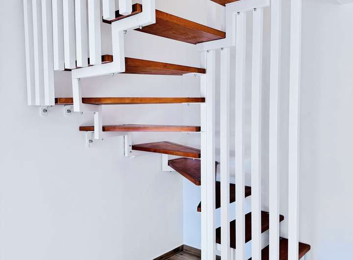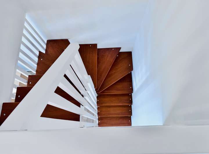 * Interne Massivholztreppe mit weißem Geländer in der Maisonette
