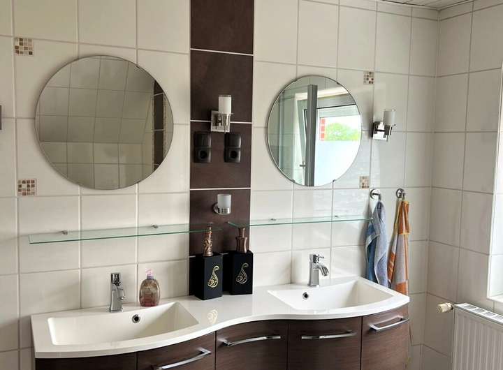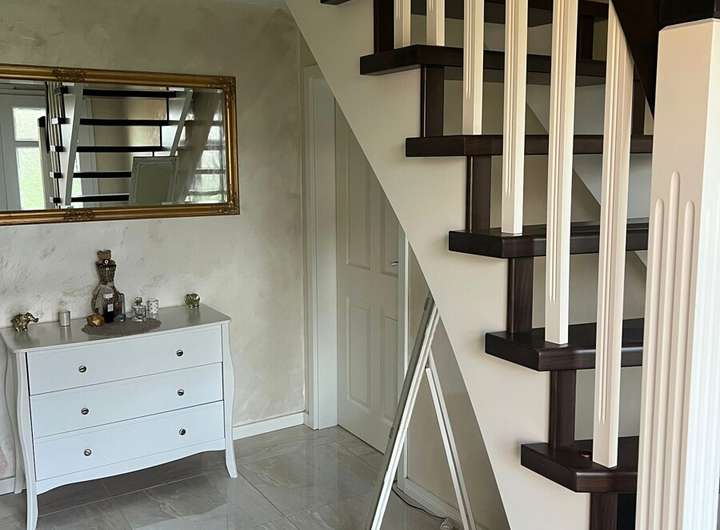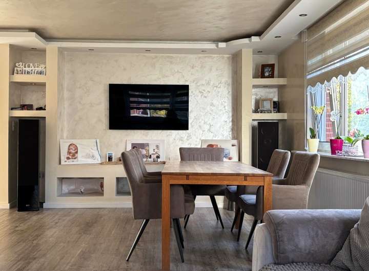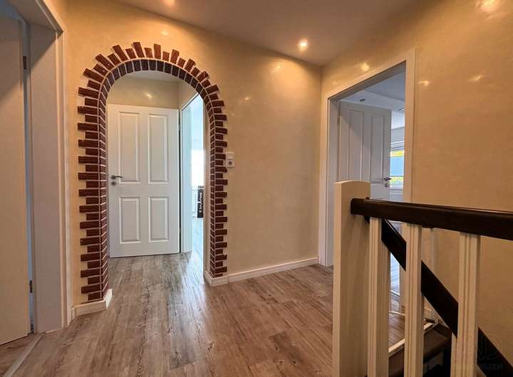 Zwischen 2018 und 2020 wurde das Haus umfassend renoviert. Die Wände wurden mit einem hochwertigen Marmorspachtel-Design veredelt, das dem Interieur eine elegante und zeitlose Optik verleiht. Ergänzt wird das stilvolle Erscheinungsbild durch erneuerte, weiße Innentüren, die das moderne Wohnkonzept harmonisch abrunden.