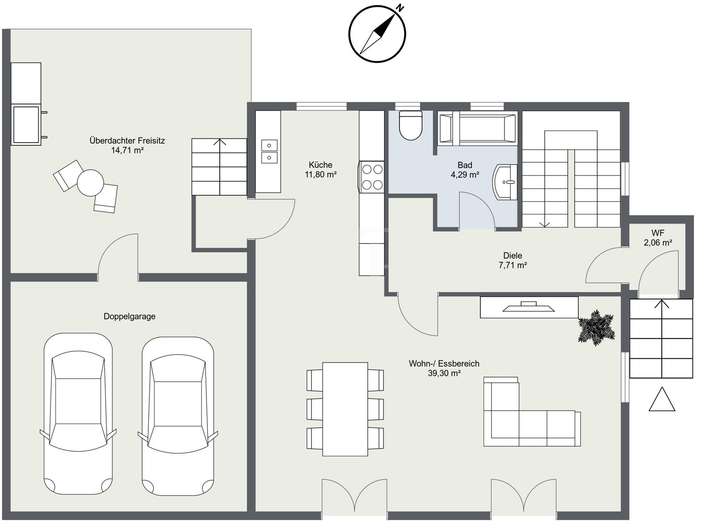 Der offen gestaltete Wohn-/ Essbereich mit Zugang zu einem überdachten Freisitz von ca. 30 m² bildet das Herzstück des Hauses. Dieser bietet einen geschützten Außenbereich für vielfältige Nutzungsmöglichkeiten – unabhängig vom Wetter. Der angrenzende Garten ist pflegeleicht angelegt und eröffnet Raum für individuelle Gestaltungsideen.