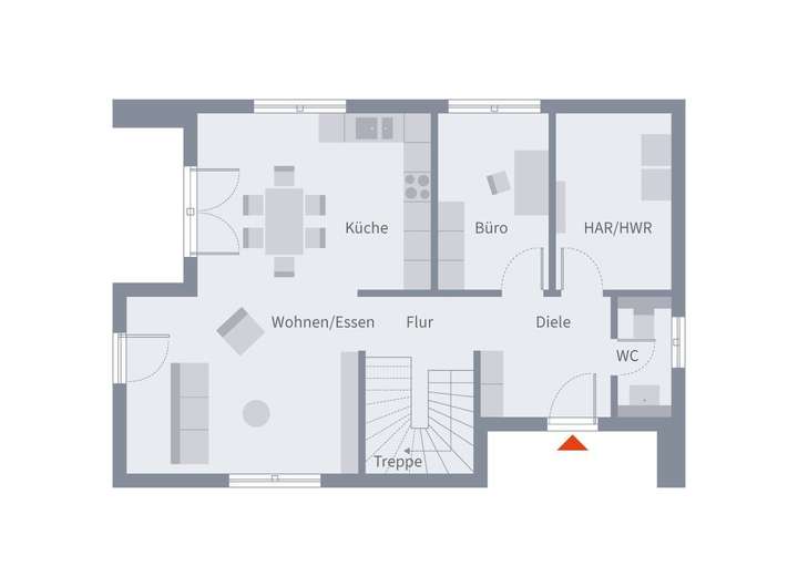 Auf zwei Ebenen vereint dieses Haus durchdachte Planung mit markantem Design. Die Fassade spielt mit Symmetrien und verleiht dem Baukörper eine besondere Präsenz, während der überdachte Eingang einen geschützten, einladenden Empfang schafft. Im Erdgeschoss öffnet sich die Diele zu einer klar gegliederten Raumfolge: Hauswirtschaftsraum und Gäste-WC sind dezent platziert, ein separates Büro bietet Rückzug für konzentriertes Arbeiten. Herzstück ist der offene Wohn-, Ess und Kochbereich, in dem großzügige Flächen und fließende Übergänge das Miteinander zum Erlebnis machen. Im Dachgeschoss sorgt die clevere Grundrissgestaltung für große Räume und einen bewusst klein gehaltenen Flur. Zwei helle Kinderzimmer, ein Elternschlafzimmer und ein komfortables Bad mit Wanne und Dusche schaffen Platz für alle Lebensphasen. Mit 149 m² bietet dieses Haus Raumqualität, die inspiriert - funktional, großzügig und im Detail präzise gestaltet.