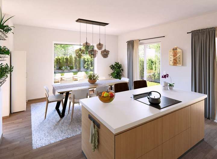 Das Herz dieses Hauses schlägt im offenen Küchen-, Wohn- und Essbereich, in dem Kochen, Genießen und Wohnen fließend ineinander übergehen und dennoch harmonisch gegliedert bleiben. Die Küche schließt praktisch an den Hauswirtschaftsraum an, kurze Wege erleichtern den Alltag. Ein separates Büro im Erdgeschoss bietet Raum für konzentriertes Arbeiten, Gäste-WC und Diele fügen sich unaufdringlich in die Grundrissstruktur ein. Im Dachgeschoss verbinden sich Funktion und Großzügigkeit: Zwei lichtdurchflutete Kinderzimmer, ein Elternschlafzimmer und ein komfortables Bad gruppieren sich um eine ästhetische Galerie, die dem Geschoss Leichtigkeit verleiht und den Blick ins Haus öffnet. Von außen setzt das Haus ein klares architektonisches Statement. Der moderne Silhouettenüberstand sorgt für Tiefe, während Symmetrien und feine Fassadenabsetzungen für visuelle Spannung sorgen. Der überdachte Hauseingang empfängt Bewohner und Gäste gleichermaßen einladend - ein Haus, das innen wie außen mit Anspruch geplant ist.