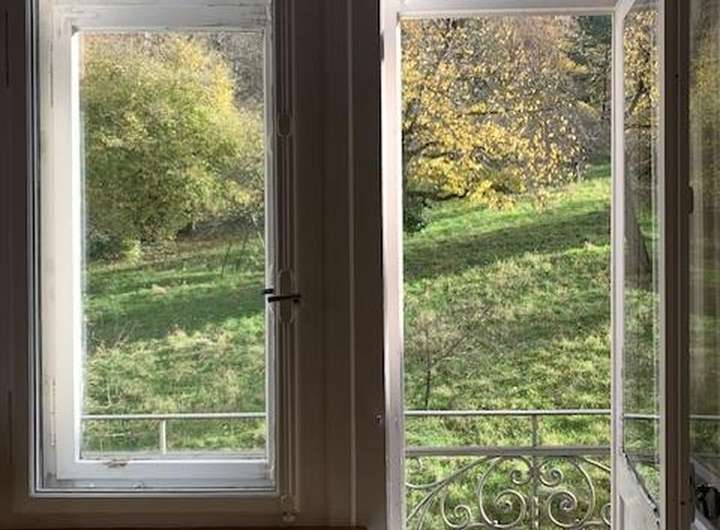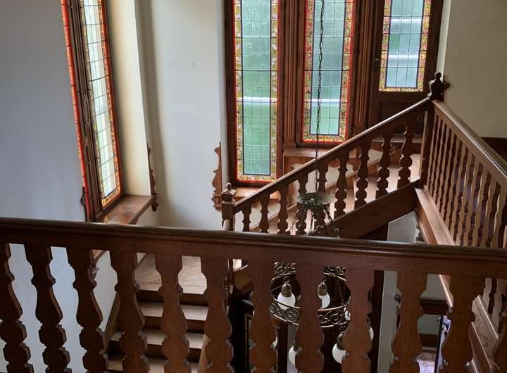 Edles Fischgrätenparkett, hohe bunte Glasfenster, weiße Türen mit kunstvollen Verzierungen und Ornamenten, dezente Stuckelemente an den Decken, großflächige Fenster mit originalen Griffen und Rollläden, Garage, toller Garten.