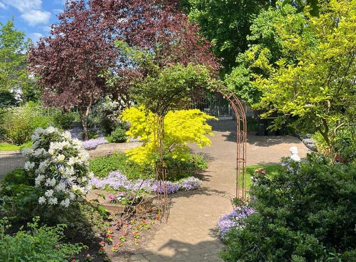 + überdachter, geschwungener Balkon mit Blick in den Garten