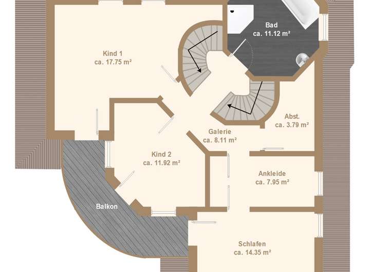 Im Dachgeschoss erwarten Sie ein luxuriöses Bad mit freistehender Wanne und ebenerdiger Dusche, ein elegantes Ankleidezimmer, Schlafzimmer, Kinderzimmer sowie ein Arbeitsbereich. Das Highlight ist ein geschwungener Balkon mit traumhaftem Gartenblick.