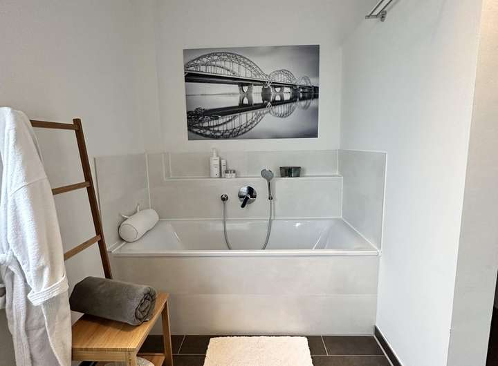 - SPA-Bereich: Große Dusche, Badewanne, zwei Waschbecken, Bidet, WC, KLAFS Sauna mit Sanarium-Funktion, Kommode, zwei Spiegel.