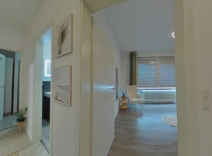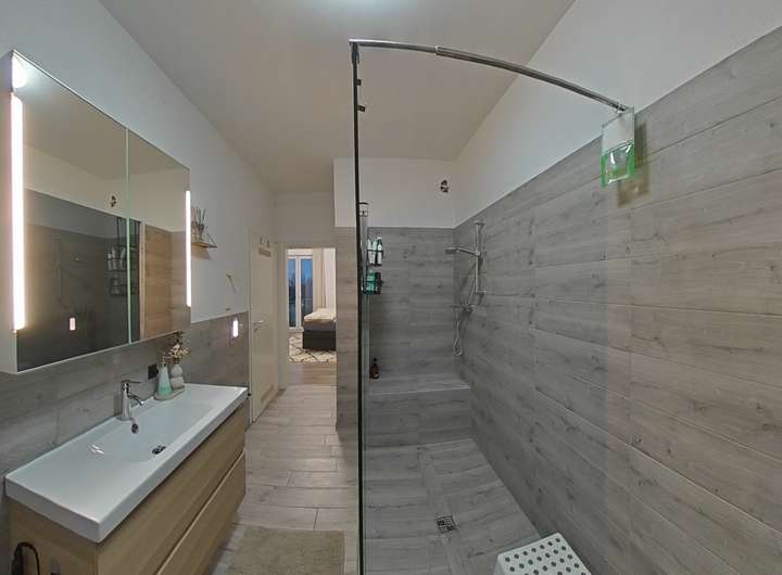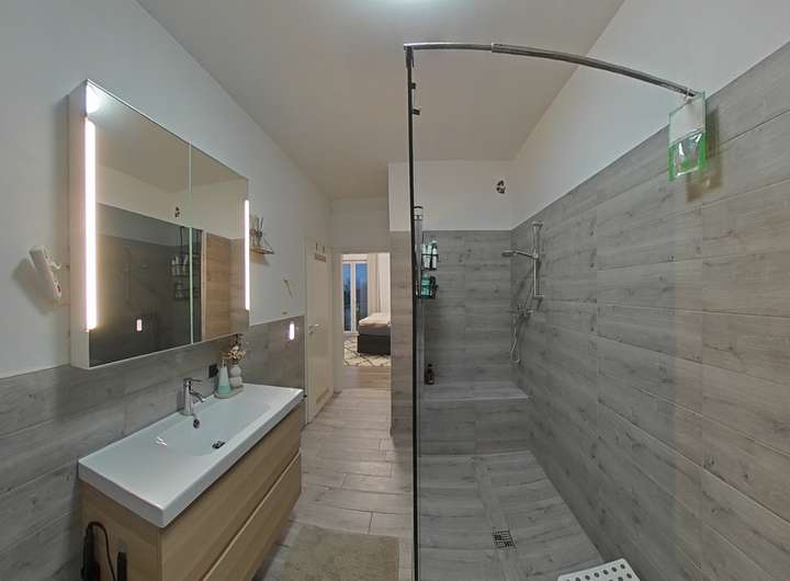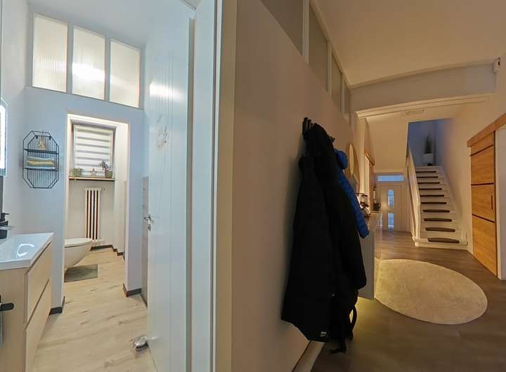 Im Obergeschoss befinden sich drei große Schlafzimmer sowie zwei frisch renovierte Bäder mit Fußbodenheizung, bodengleichen Duschen und hochwertigen Armaturen.