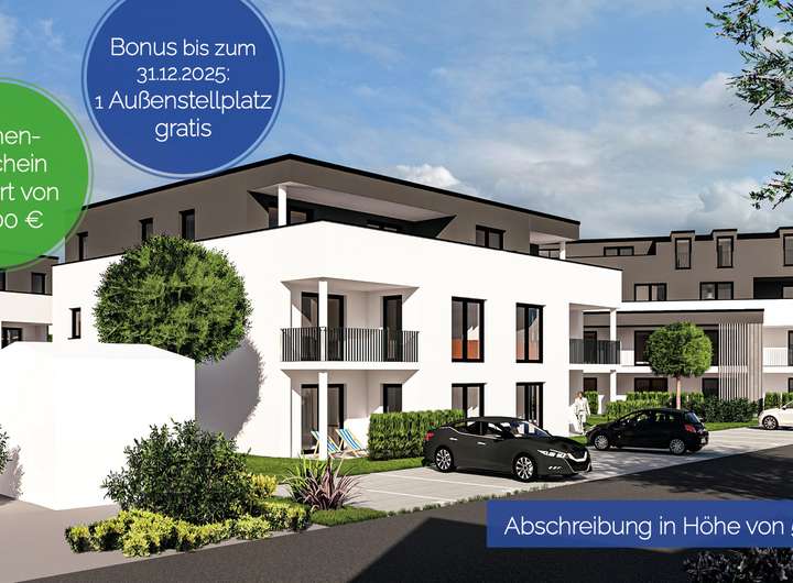 Beim Kauf einer Wohnung bis zum 31.12.2025 erhalten Sie eine Küche im Wert von 10.000,00 € und einen Außenstellplatz gratis.