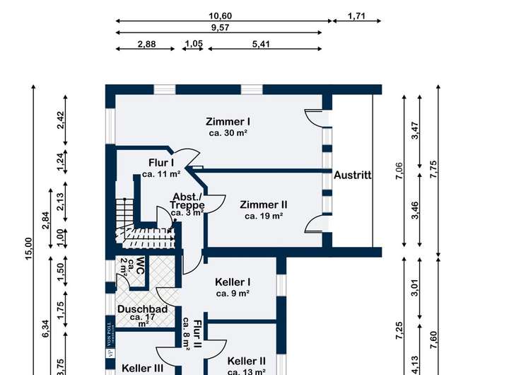 Das Kellergeschoss umfasst ca. 69 m² Wohnfläche sowie zusätzliche Kellerräume und wurde in der Vergangenheit gewerblich genutzt – hier befand sich ein Ballettstudio. Zwei Wohnräume mit großen Tageslichtfenstern, drei Kellerräume, ein Duschbad und ein weiterer Abstellraum bieten flexible Gestaltungsmöglichkeiten. Ob als zusätzlicher Wohnbereich, Hobby- oder Arbeitsräume oder zur Verbindung von Wohnen und Gewerbe: Die Nutzungsmöglichkeiten sind vielfältig und attraktiv.
