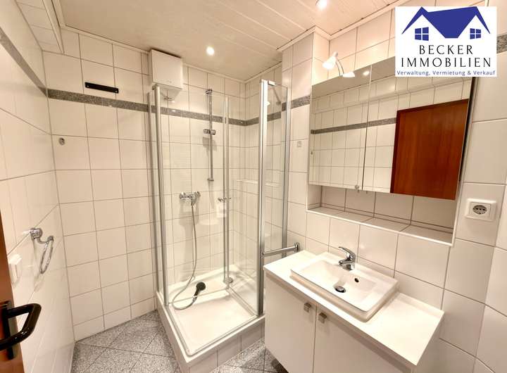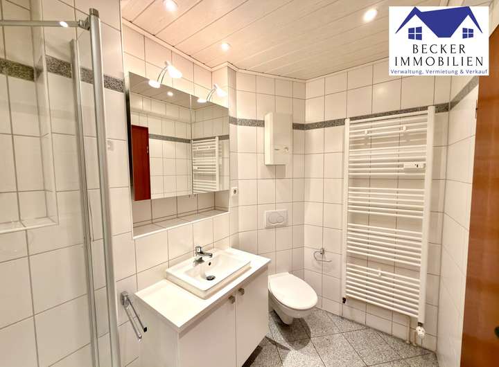 Das modernisierten Badezimmer erwarten Sie eine praktische Dusche und ein stilvoller Handtuchheizkörper – perfekt für einen warmen Empfang nach einem langen Tag.