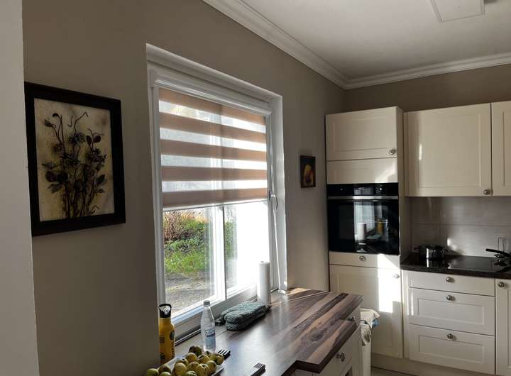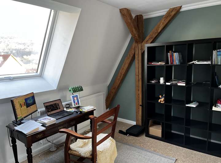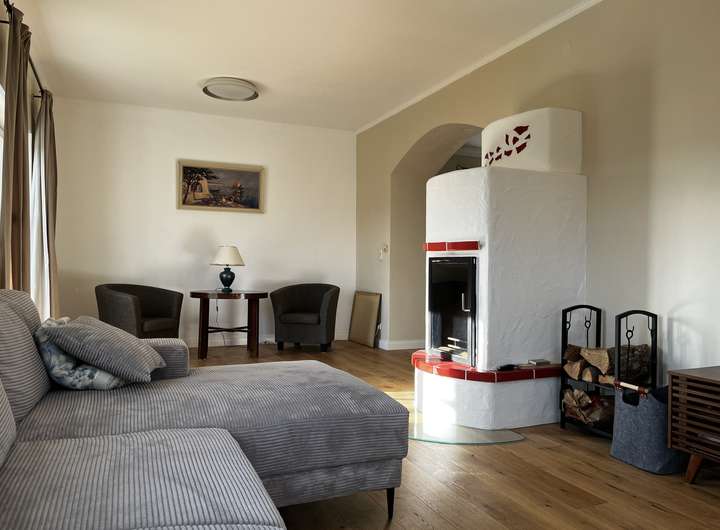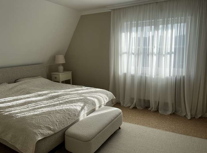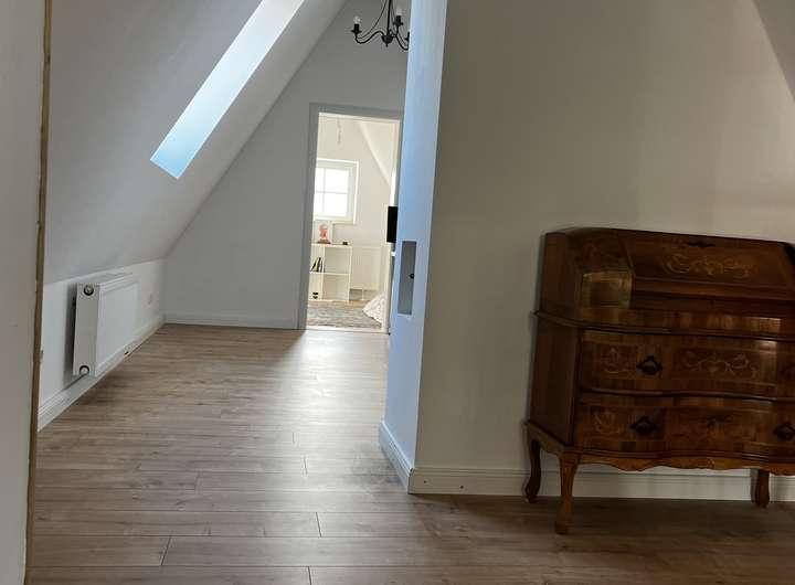 Im 1.OG befindet sich eine große Schlafzimmer mit neuem Bett, ein Bürozimmer (kann als Kinderzimmer verwendet werden) mit Regal, Arbeitstisch und Klappbaren Sofa, ein weiteres Durchgangszimmer mit Ledersofa.