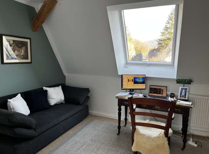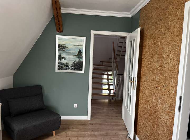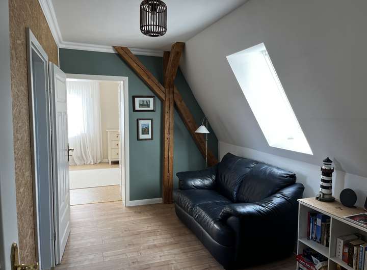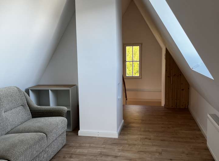 Im ausgebauten DG gibt es zwei weitere Zimmer mit Sofa und kleinen Regalen.