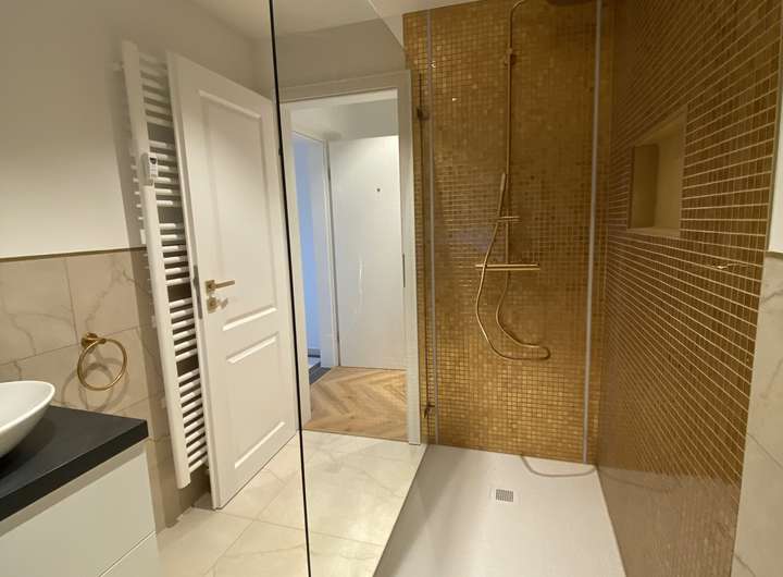-Gefliestes Tageslichtbad mit Handtuchtrockner