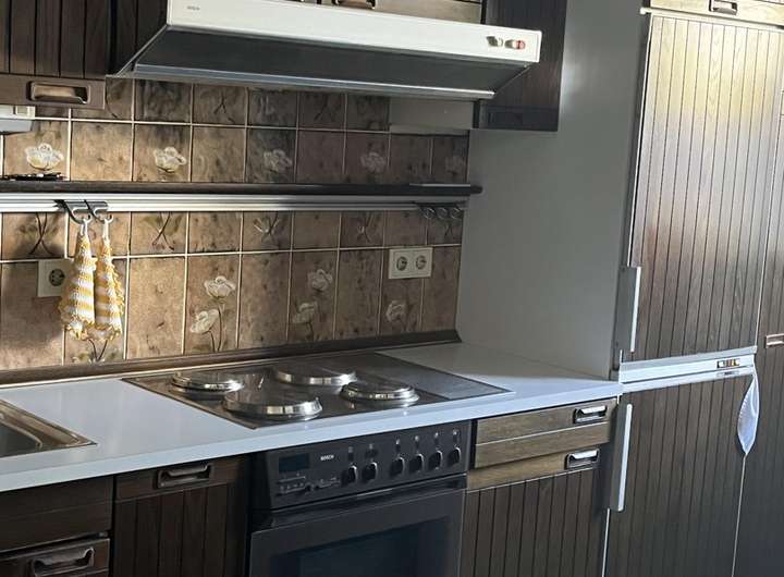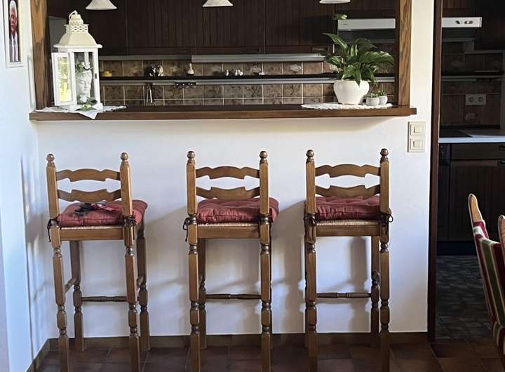 -Es ist eine Einbauküche vorhanden mit Esstresen der von beiden Seiten genutzt werden kann. Vom Flur aus mit Barhockern, von der Küche aus mit Stühlen.