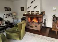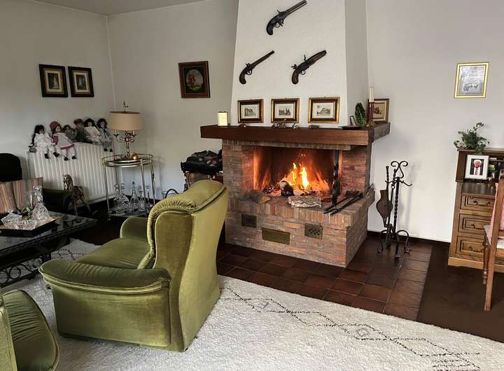-Im Wohnzimmer ist ein gemauerter Kamin installiert.