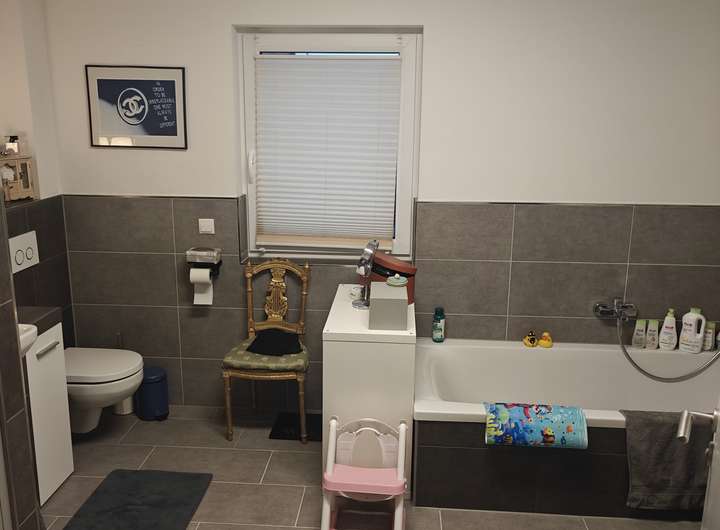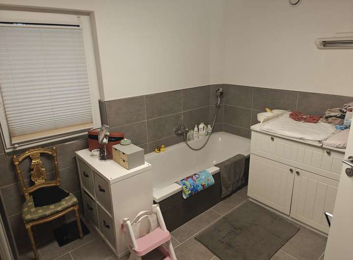- Badezimmer mit Badewanne und bodengleicher Dusche