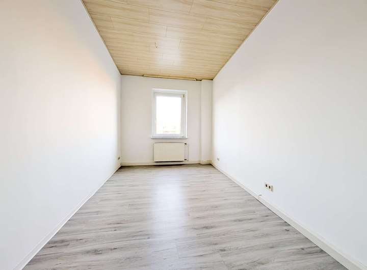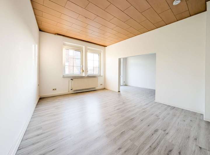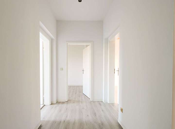 Beim Betreten der Wohnung gelangen Sie zunächst in den zentralen Flur, von dem alle Räume erreichbar sind. Links befindet sich das modern ausgestattete Bad mit Wanne und Fenster. Anschließend folgt die funktional geschnittene Küche. Geradeaus erreichen Sie das Schlafzimmer, das sich als ruhiger Rückzugsbereich anbietet. Rechts vom Flur liegen Esszimmer und daran anschließend der offene, großzügige Wohnbereich.