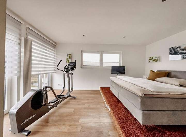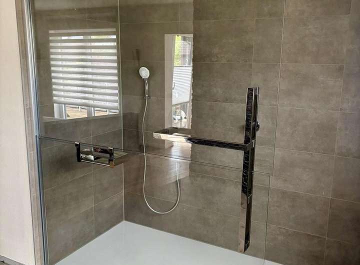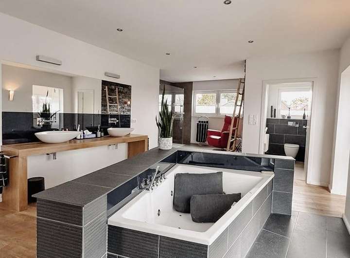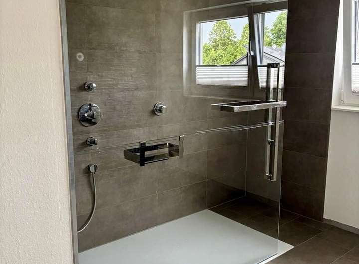 Das Masterbad im OG gleicht einer Wellness-Oase und bietet Ihnen den Luxus von Komfort und Stil. Hier können Sie sich in dem Whirlpool mit Blick und Zugang auf die Dachterrasse entspannen und den Alltagsstress hinter sich lassen. Die große begehbare Dusche (u.a. mit der Hans Grohe Raindance Kopfbrause) ist überwiegend 2025 modernisiert worden.