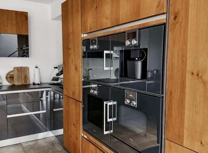 Die moderne und geschmackvolle Küche aus 2016 lässt das Herz jeden Hobbykochs höherschlagen: Gaggenaugeräte wie Espressovollautomat, Mikrobackofen, Backofen, Wärmeschublade, Geschirrspüler und Dampfgarer kombiniert mit einem 80 cm Flex-Induktionskochfeld sowie einem Liebherr Wein-Klimaschrank.