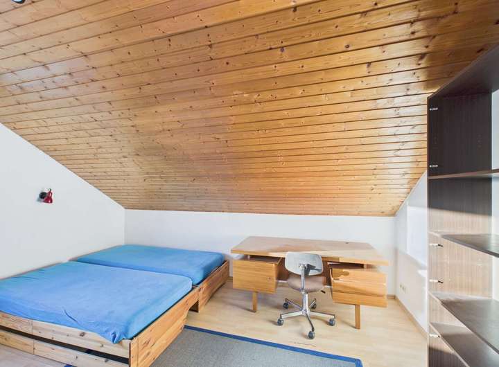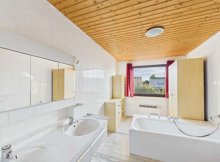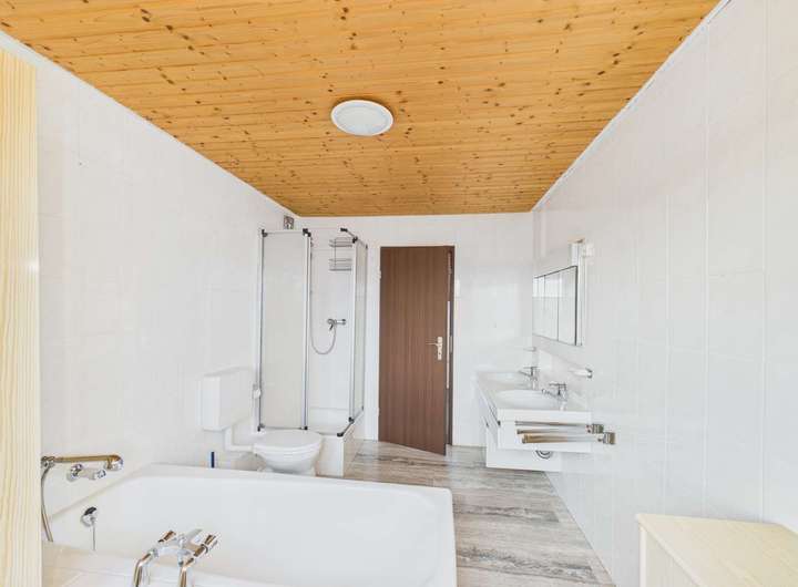 Im Obergeschoss befinden sich 4 weitere große Zimmer, die durch den Gaubeneinbau noch an Großzügigkeit gewonnen haben. Das komfortable Masterbad mit Wanne, Dusche und zwei Waschbecken ist zwar nicht mehr ganz so neu, aber sehr gepflegt.