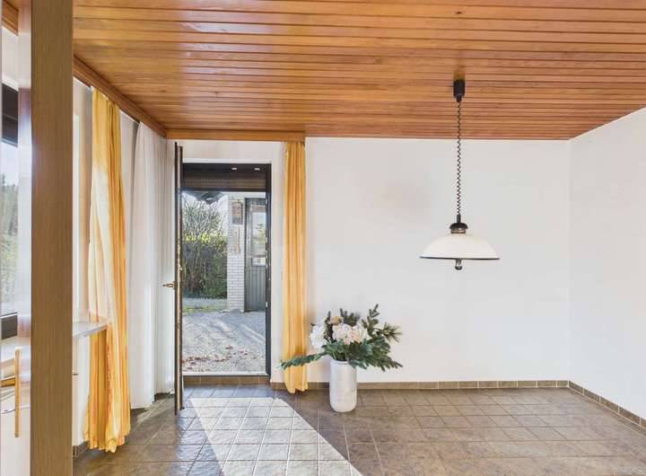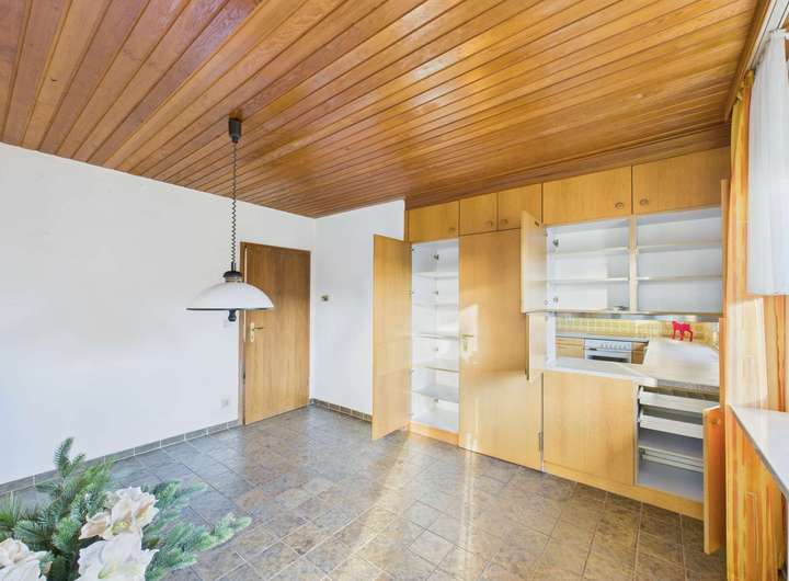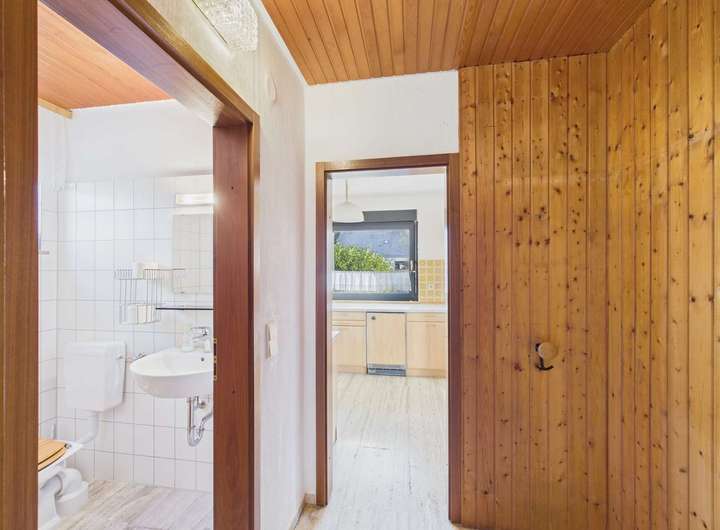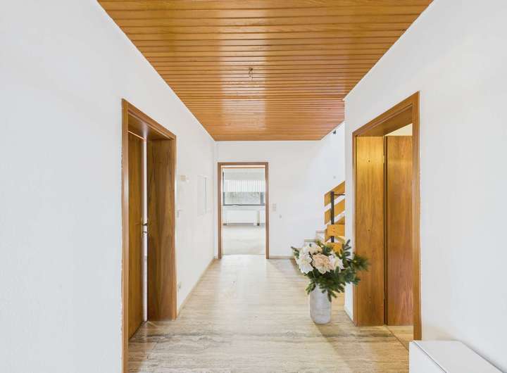 Es erwartet Sie ein großzügiger Flur. An seinem Ende geht es in das Wohnzimmer mit Kaminecke und Zugang zur geschützten Südterrasse. Doch vorher haben Sie auf der linken Seite den Garderobenbereich mit Gäste-WC und Zugang zur Küche sowie Verbindung zum Esszimmer. Das Esszimmer können Sie auch vom Flur aus betreten und Sie haben einen direkten Zugang zur Terrasse. Esszimmer und Küche sind durch ein Schrankkonzept miteinander verbunden, in dem viel Geschirr Platz findet. Eine Besonderheit ist die "Durchreiche", die mit integriert wurde.