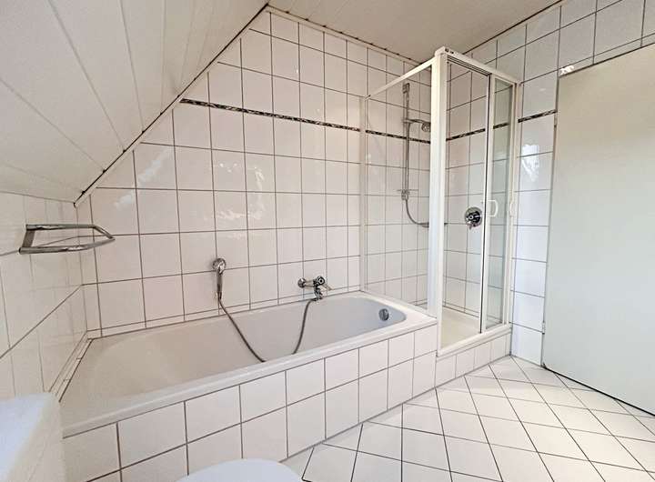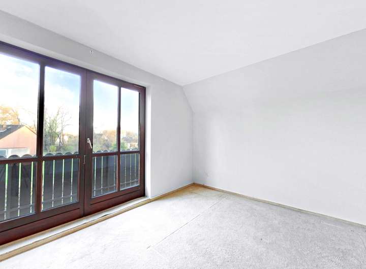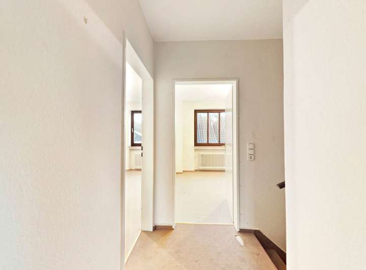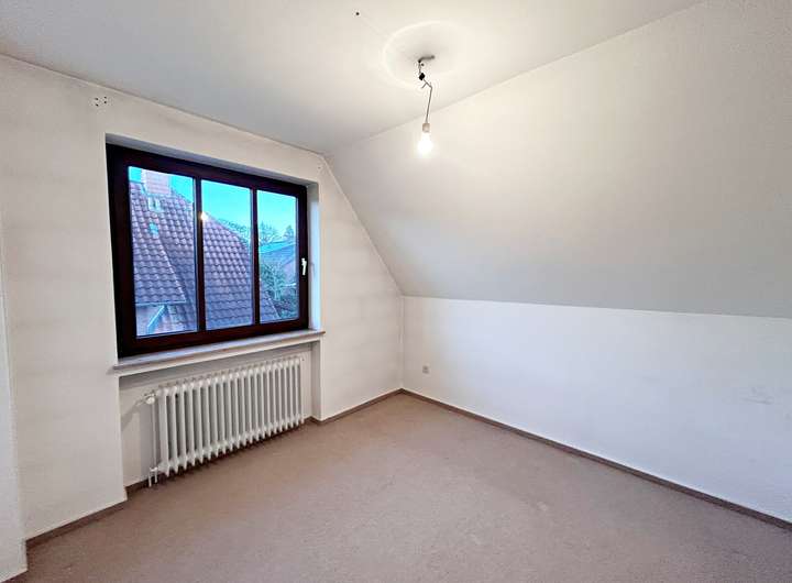 Über die Treppe gelangt man ins Obergeschoss. Hier befindet sich das große Schlafzimmer, das dank der angrenzenden Balkontür besonders hell wirkt und einen schönen Blick in den Garten bietet. Zwei weitere Zimmer – ideal als Kinderzimmer, Büro oder Gästezimmer – sowie ein Badezimmer runden diese Etage ab. Ein zusätzlicher Abstellraum schafft praktischen Stauraum für alles, was nicht täglich benötigt wird.