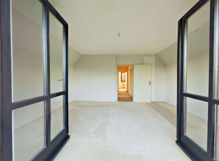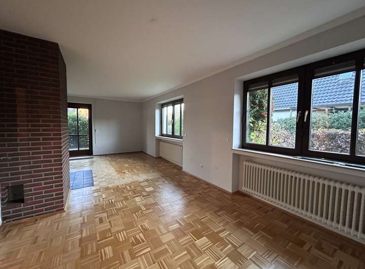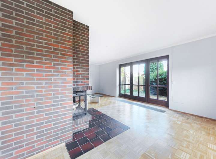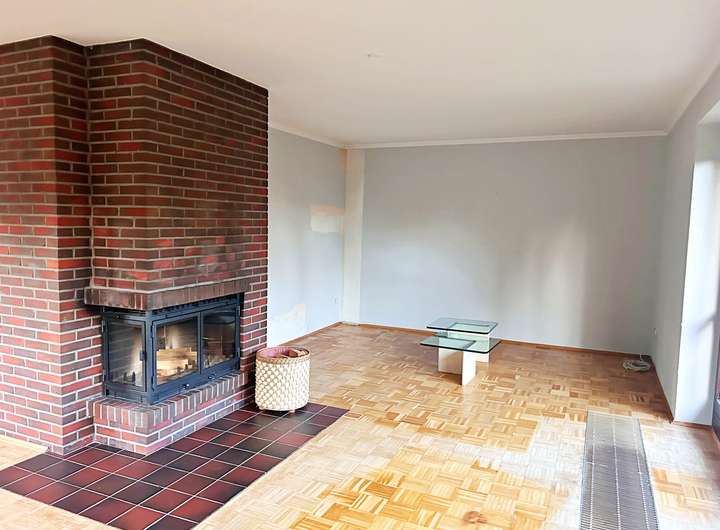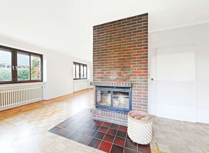 Das Herzstück des Hauses ist jedoch das großzügige Wohnzimmer. Der eindrucksvolle Kamin aus rotem Klinker verleiht dem Raum Wärme und Charakter. Zusammen mit dem hochwertigen Stäbchenparkett entsteht eine Atmosphäre, die man nur schwer in Worte fassen kann – ein Ort, an dem man sich automatisch gern aufhält. Die gut erhaltenen dunklen Holzfenster passen perfekt zu diesem Stil und unterstreichen das warme, authentische Wohngefühl.