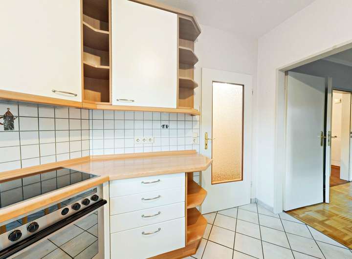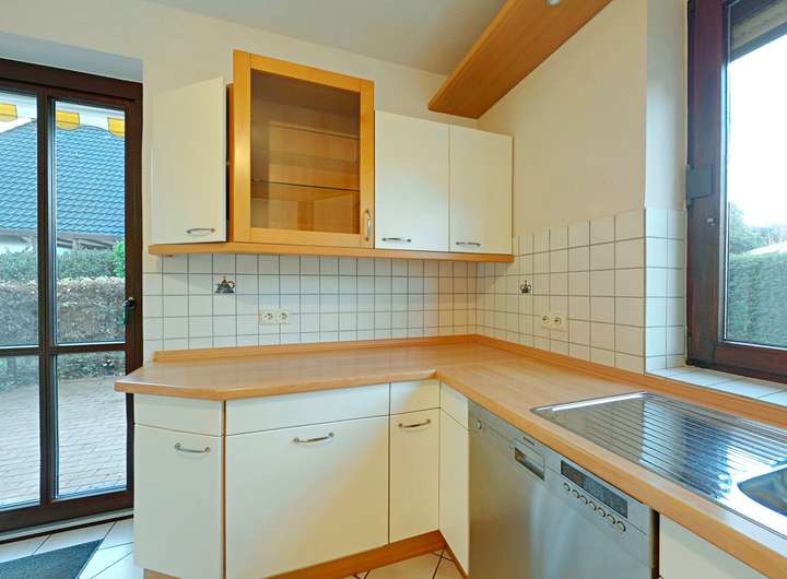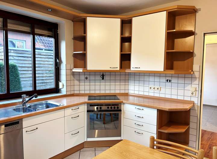 Vom Flur aus erreicht man zunächst die Küche, die einen direkten Zugang zum Wohn- und Esszimmer bietet. Große Fenster sorgen hier für viel Licht und geben dem Raum eine angenehme Offenheit. Durch die Verbindung zur Terrasse entsteht ein harmonischer Übergang zwischen drinnen und draußen – ideal für gemeinsame Mahlzeiten, gemütliche Abende oder entspannten Alltag.