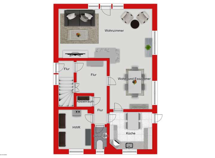 Ebenfalls im Erdgeschoss befinden sich ein Gäste-WC, ein praktischer Abstellraum sowie der Hauswirtschaftsraum.