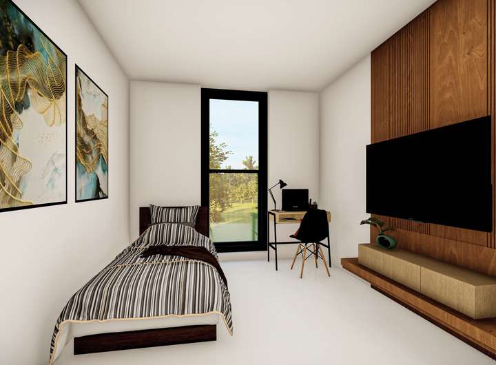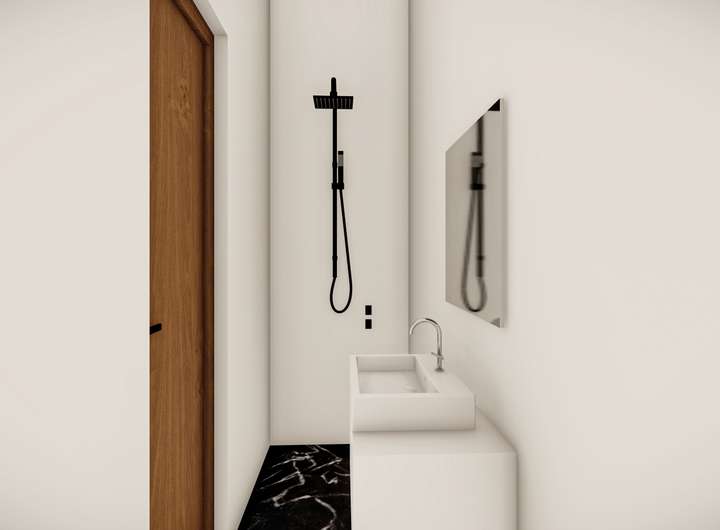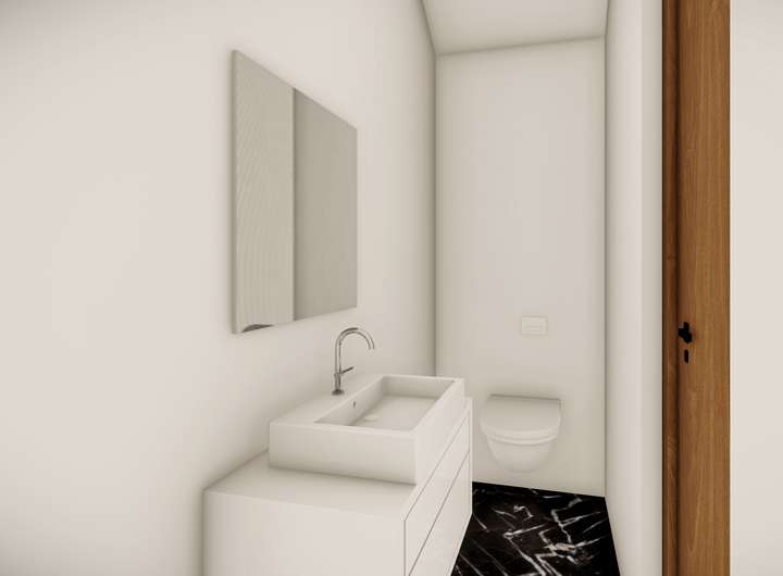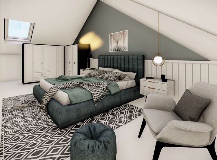 Das Dachgeschoss ist als Elternbereich konzipiert. Hier befindet sich ein großzügiges Schlafzimmer, das durch eine integrierte Ankleide nochmals aufgewertet wird. Ein eigenes Bad mit Dusche ermöglicht ein hohes Maß an Privatsphäre und schafft eine kleine, persönliche Rückzugsoase abseits des Familiengeschehens.