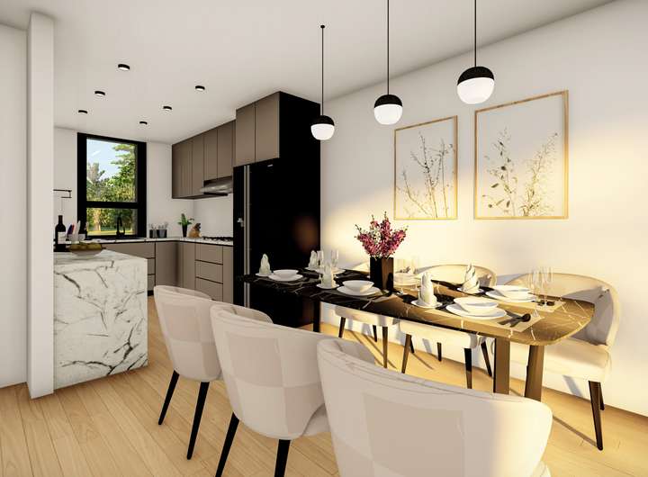 Bereits im Erdgeschoss öffnet sich der Eingangsbereich zu einem großzügigen, lichtdurchfluteten Wohn- und Essbereich. Die weitläufige Fensterfront sorgt für ein angenehmes Raumgefühl und ermöglicht gleichzeitig den direkten Zugang zum Garten. Die offene Küche fügt sich harmonisch in diesen Wohnbereich ein und schafft einen modernen Mittelpunkt des täglichen Lebens. Ein Gäste-WC komplettiert diese Ebene und sorgt für zusätzlichen Komfort im Alltag.
